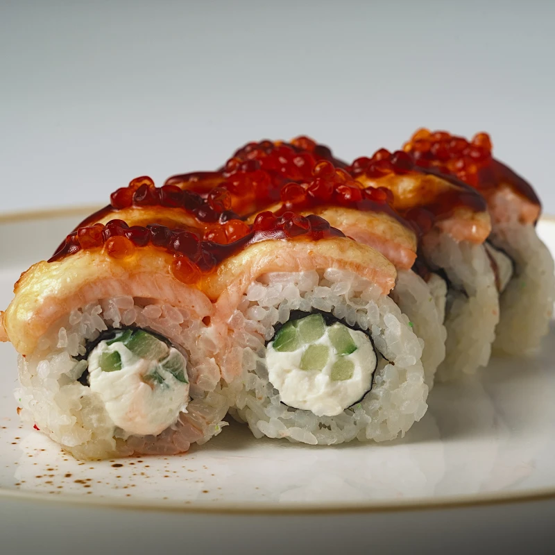 Премиальный запечённый ролл для истинных гурманов. Сердце ролла — нежный сливочный сыр и свежий огурец, создающие лёгкий и освежающий вкус. Сверху — тающее запечённое филе лосося под фирменным соусом, украшенное щедрой порцией икры, которая добавляет яркий солёно-морской акцент и делает вкус по-настоящему благородным.