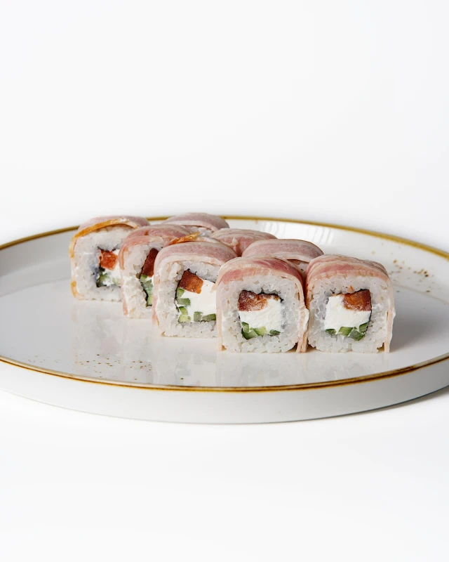 Сливочный сыр, огурец и свежий томат в нежной шубе из бекона. Сытно, мягко и очень ароматно.