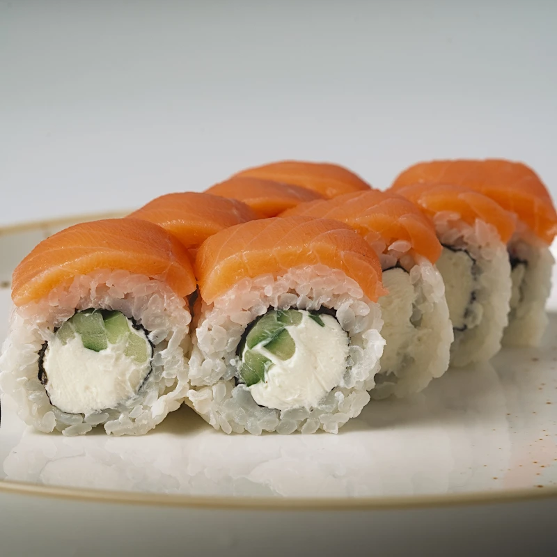 Классическая «Филадельфия»: нежный сливочный сыр, свежий огурец и шапка из сочного лосося — гармония вкуса, знакомая каждому.
