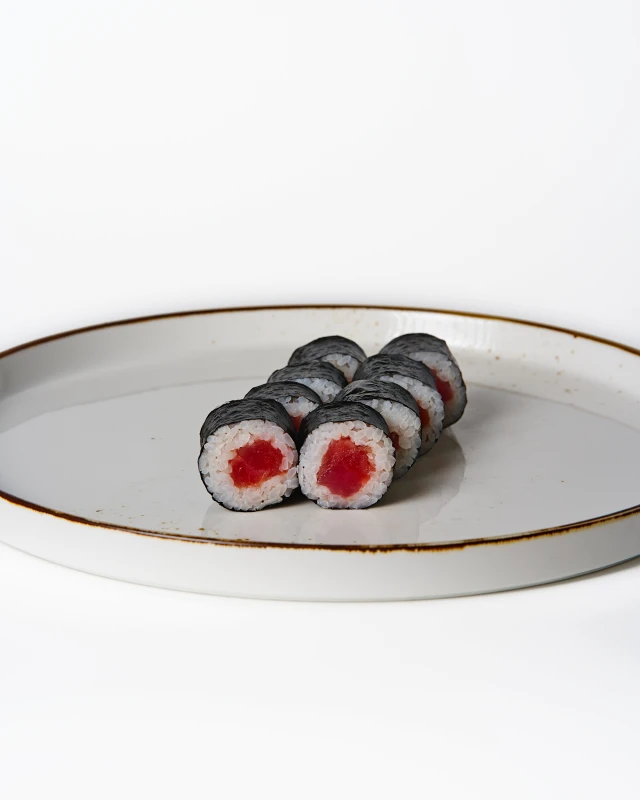 Классический ролл с тунцом: сочные кусочки свежего тунца, обёрнутые в нежный рис и лист нори. Лёгкий, чистый вкус океанической рыбы — идеальный выбор для ценителей минимализма и традиционной японской кухни.