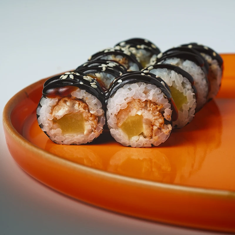 Нежный ролл с сочным угрем и сладким маринованным такуаном. Сверху покрыт волной густого унаги-соуса и посыпан кунжутом, что добавляет лёгкий ореховый аромат и делает вкус ещё более гармоничным и выразительным. Идеален для любителей необычных, сладко-солёных сочетаний.