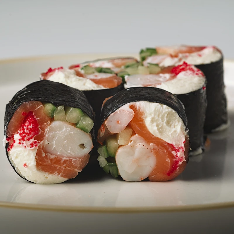 Премиальный ролл с креветкой, лососем, сливочным сыром, огурцом и тобико, завернутый в хрустящую нори — насыщенный вкус без риса, максимум начинки.