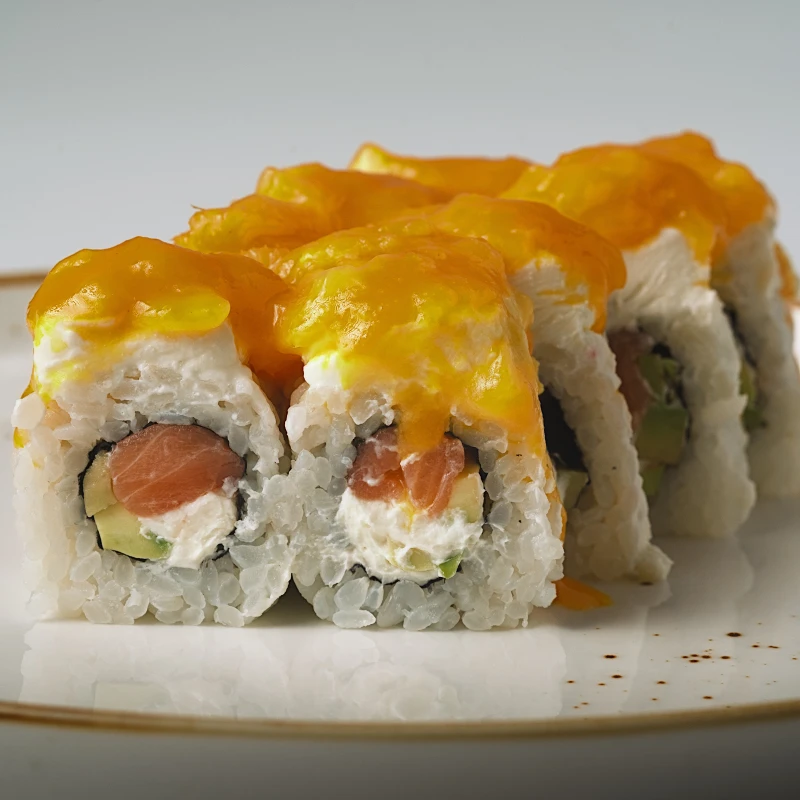 Сливочный ролл с лососем и авокадо под шапкой из манго — яркий, насыщенный и идеально тягучий.