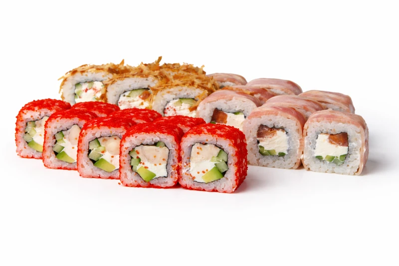 Бекон сэнсэй ролл, красный самурай ролл, тацу с крабом и бонито ролл. 24 шт.